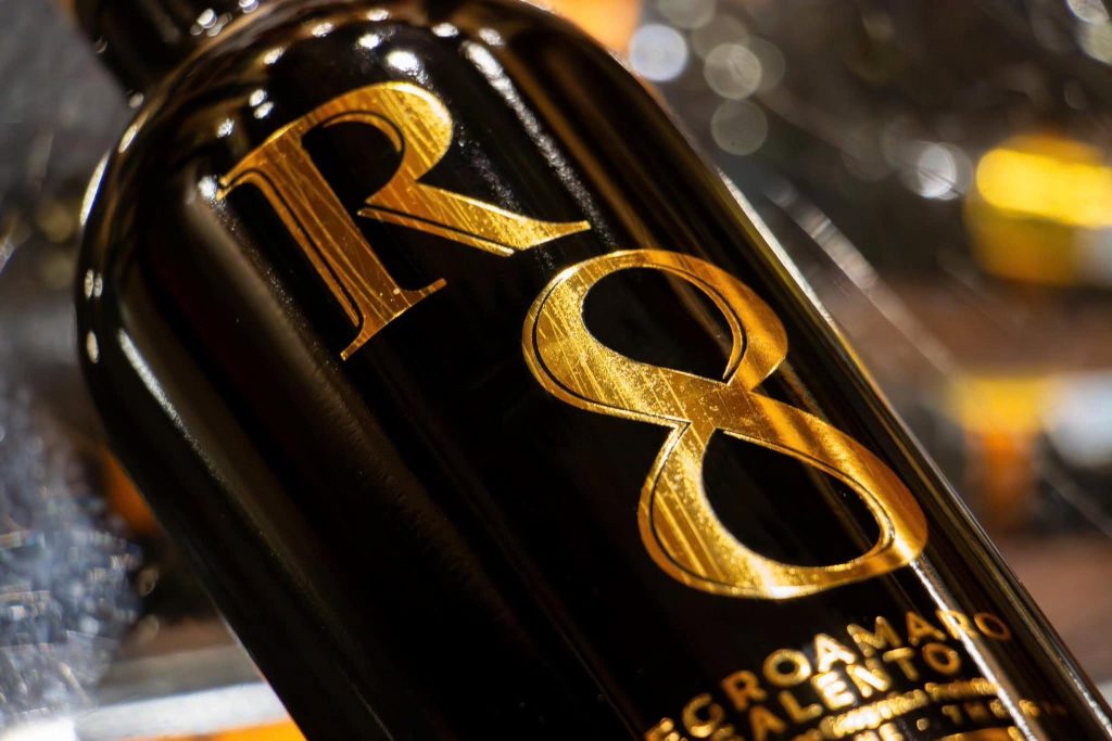 R8 Negroamaro nổi bật với thiết kế đen bóng huyền bí, được điểm xuyết bởi số 8 ánh vàng kim và chữ R mạnh mẽ, tượng trưng cho sự vĩnh cửu và thịnh vượng.